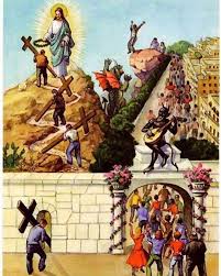 Pendant une discussion entre mon confesseur et moi, il m’avait dit qu’il est difficile d’être sauvé parce que Jésus-Christ a dit : « La porte est étroite et vous devez vous efforcer de la franchir. » Après la communion, Jésus me dit : « Pauvre de Moi, comme on me considère mesquin. Dis à ton confesseur que c’est à partir de leurs propres mesquineries qu’ils me considèrent mesquin. Ils ne me voient pas comme l’Être grand, sans limites, puissant et infini en toutes ses perfections, qui peut faire passer de grandes multitudes par des portes étroites mieux que par de larges portes. » Pendant qu’Il parlait, il me sembla voir un sentier très étroit conduisant à une porte très étroite, mais bondé de gens en train de compétitionner pour voir qui pourrait avancer le plus et franchir la porte. Il ajouta : « Vois, ma fille, quelle grande foule se bouscule pour savoir qui arrivera le premier. Dans une compétition, il y a beaucoup d’activités. Si le sentier était large, les gens ne se presseraient pas, sachant qu’il y a beaucoup de place pour y cheminer quand ils le voudront. Cependant, pendant qu’ils prendront bien leur temps, la mort pourrait survenir et ils pourraient ne pas se trouver en route sur le sentier étroit. Ils se retrouveraient alors sur le seuil de la large porte de l’enfer. Oh ! Comme est utile cette étroitesse ! […] Il en va ainsi concernant le salut : si son sentier était large, peu se hâteraient d’arriver, et la fête du Ciel serait pour peu de personnes. »