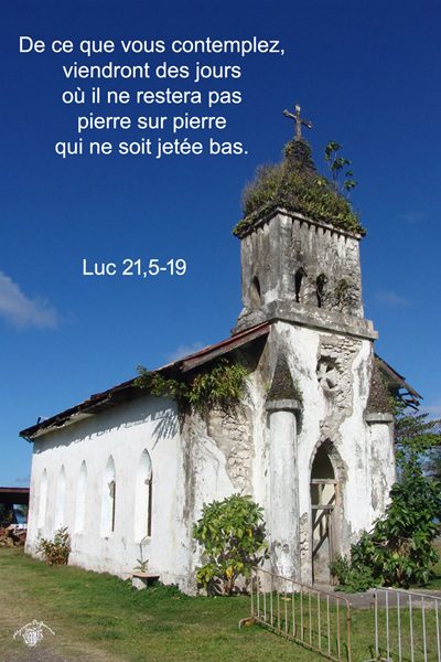 En ce temps-là, comme certains disciples de Jésus parlaient du Temple, des belles pierres et des ex-voto qui le décoraient, Jésus leur déclara : « Ce que vous contemplez, des jours viendront où il n’en restera pas pierre sur pierre : tout sera détruit. » Ils lui demandèrent : « Maître, quand cela arrivera-t-il ? Et quel sera le signe que cela est sur le point d’arriver ? » Jésus répondit : « Prenez garde de ne pas vous laisser égarer, car beaucoup viendront sous mon nom, et diront : ‘C’est moi’, ou encore : ‘Le moment est tout proche.’ Ne marchez pas derrière eux ! Quand vous entendrez parler de guerres et de désordres, ne soyez pas terrifiés : il faut que cela arrive d’abord, mais ce ne sera pas aussitôt la fin. » Alors Jésus ajouta : « On se dressera nation contre nation, royaume contre royaume. Il y aura de grands tremblements de terre et, en divers lieux, des famines et des épidémies ; des phénomènes effrayants surviendront, et de grands signes venus du ciel. Mais avant tout cela, on portera la main sur vous et l’on vous persécutera ; on vous livrera aux synagogues et aux prisons, on vous fera comparaître devant des rois et des gouverneurs, à cause de mon nom. Cela vous amènera à rendre témoignage. Mettez-vous donc dans l’esprit que vous n’avez pas à vous préoccuper de votre défense. C’est moi qui vous donnerai un langage et une sagesse à laquelle tous vos adversaires ne pourront ni résister ni s’opposer. Vous serez livrés même par vos parents, vos frères, votre famille et vos amis, et ils feront mettre à mort certains d’entre vous. Vous serez détestés de tous, à cause de mon nom. Mais pas un cheveu de votre tête ne sera perdu. C’est par votre persévérance que vous garderez votre vie. »