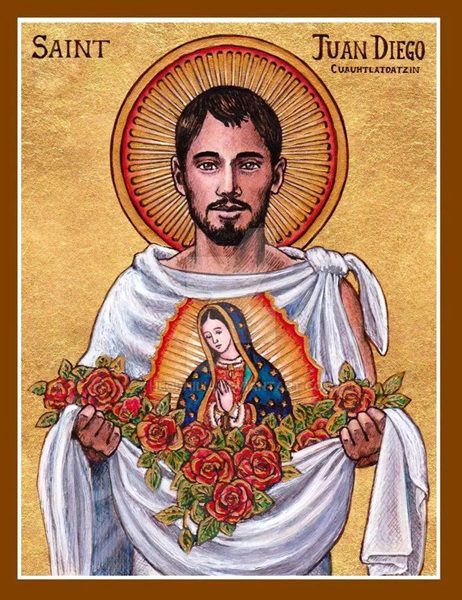 Né au sein de l’Empire Aztèque, au centre de l’actuel Mexique. Il eut cinq apparitions de la Vierge Marie, du 9 au 12 décembre 1531, sur le Mont du Tepeyac. Après les apparitions, Juan Diego vécut pendant 17 ans comme ermite, il s’occupait de la chapelle et des premiers pèlerins venus vénérer l’image de Notre Dame de Guadalupe.