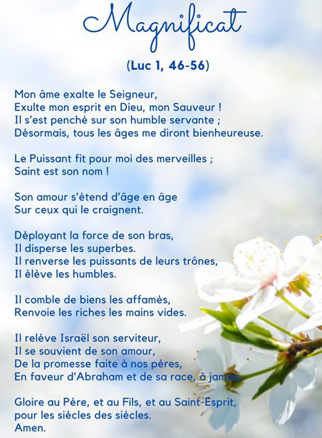 Par ce cantique, je disais que le Seigneur avait fait de grandes choses en moi, sa servante, et que tous les âges allaient me dire bienheureuse.