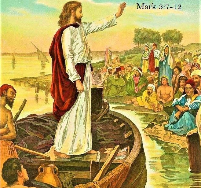 En ce temps-là, Jésus se retira avec ses disciples près de la mer, et une grande multitude de gens, venus de la Galilée, le suivirent. De Judée, de Jérusalem, d’Idumée, de Transjordanie, et de la région de Tyr et de Sidon vinrent aussi à lui une multitude de gens qui avaient entendu parler de ce qu’il faisait. Il dit à ses disciples de tenir une barque à sa disposition pour que la foule ne l’écrase pas. Car il avait fait beaucoup de guérisons, si bien que tous ceux qui souffraient de quelque mal se précipitaient sur lui pour le toucher. Et lorsque les esprits impurs le voyaient, ils se jetaient à ses pieds et criaient : « Toi, tu es le Fils de Dieu ! » Mais il leur défendait vivement de le faire connaître.