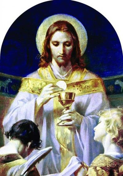 Et Jésus, d’une voix sonore et émouvante, prononce les paroles de la Consécration, et sans se laisser aller, il s’enferme lui-même dans ce pain et dans ce vin.