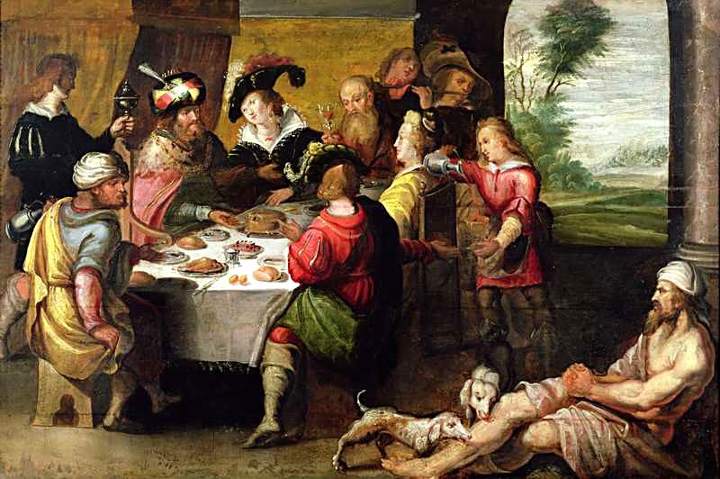 Il y avait une fois un homme très riche. Il portait les plus beaux vêtements et se pavanait dans ses habits de pourpre et de byssus sur les places publiques et chez lui. Ses concitoyens le respectaient comme le plus puissant du village et des amis flattaient son orgueil pour en tirer profit. Son logis était ouvert tous les jours pour de magnifiques festins où la foule des invités, tous riches, pas dans le besoin, se pressaient et flattaient ce riche festoyeur. Ses banquets étaient renommés pour l’abondance des mets et des vins exquis.