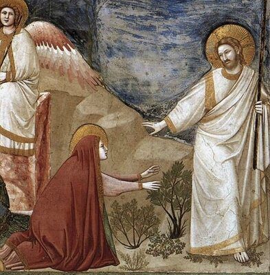 Marie Madeleine se tenait près du tombeau, au-dehors, tout en pleurs. Et en pleurant, elle se pencha vers le tombeau. Elle aperçoit deux anges vêtus de blanc, assis l’un à la tête et l’autre aux pieds, à l’endroit où avait reposé le corps de Jésus. Ils lui demandent :« Femme, pourquoi pleures-tu ? » Elle leur répond : « On a enlevé mon Seigneur, et je ne sais pas où on l’a déposé. »