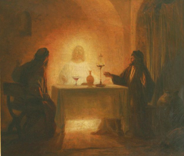 Jésus se lève, tenant dans ses mains le pain et, les yeux levés vers le ciel rouge du soir, il rend grâces pour la nourriture et s’assoit. Il rompt le pain et en donne à ses deux hôtes et, en le faisant, il se révèle pour ce qu’il est : le Ressuscité.